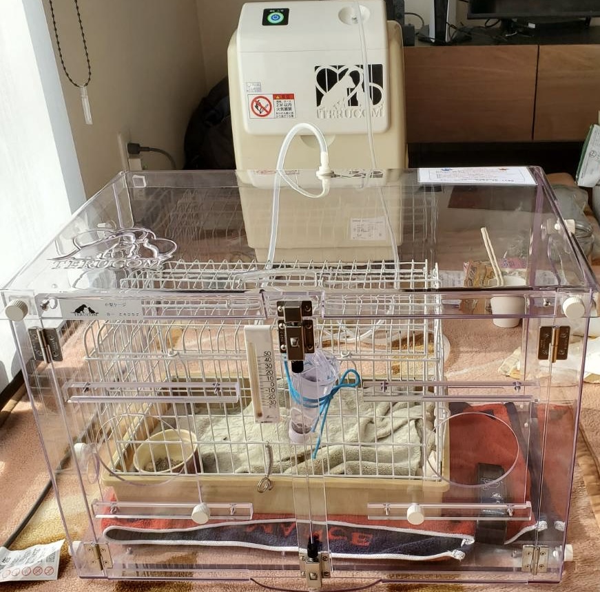 酸素ハウスの中に、普段使用していたケージが入らなかったため、移動用キャリーにかぶせてで使用しました。